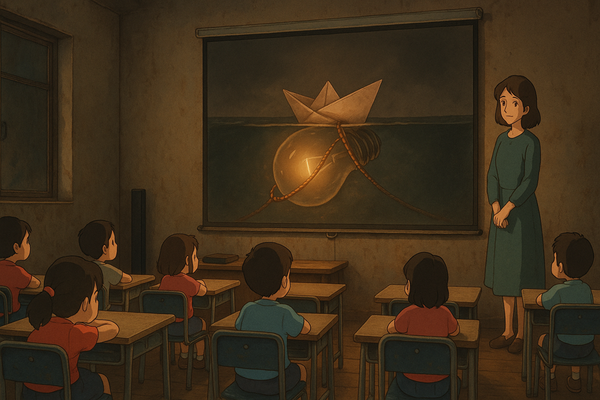 Cô giáo chiếu cho cả lớp xem về một con thuyền giấy neo trên một bóng đèn.