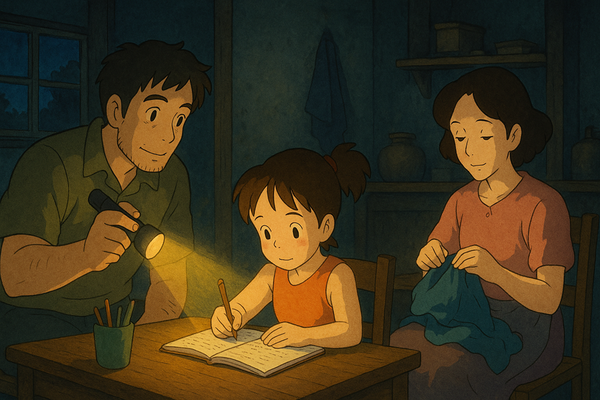 Mỗi khi mất điện, bố lại lấy đèn pin soi cho tôi học. Mẹ ngồi may áo dưới ánh sáng mờ, còn tôi viết nốt bài văn bằng cây bút năm nào. Mực đôi khi tắc, phải lắc mạnh mới chảy, nhưng tôi vẫn kiên nhẫn. Bởi tôi hiểu, không có ánh sáng nào đến dễ dàng.