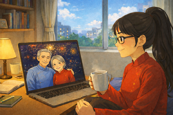 Tiếng pháo hoa giao thừa rộn rã vọng qua màn hình máy tính, tôi nhìn gia đình mình quây quần, nghe giọng mẹ nói “Năm mới bình an con nhé”, nghe bố chúc tôi mạnh mẽ và kiên định. Ở nơi cách nhà nửa vòng trái đất, những âm thanh ấy lại trở thành hơi ấm mà tôi cần nhất. Tôi lặng lẽ cười, một nụ cười vừa có nước mắt vừa có niềm hy vọng.