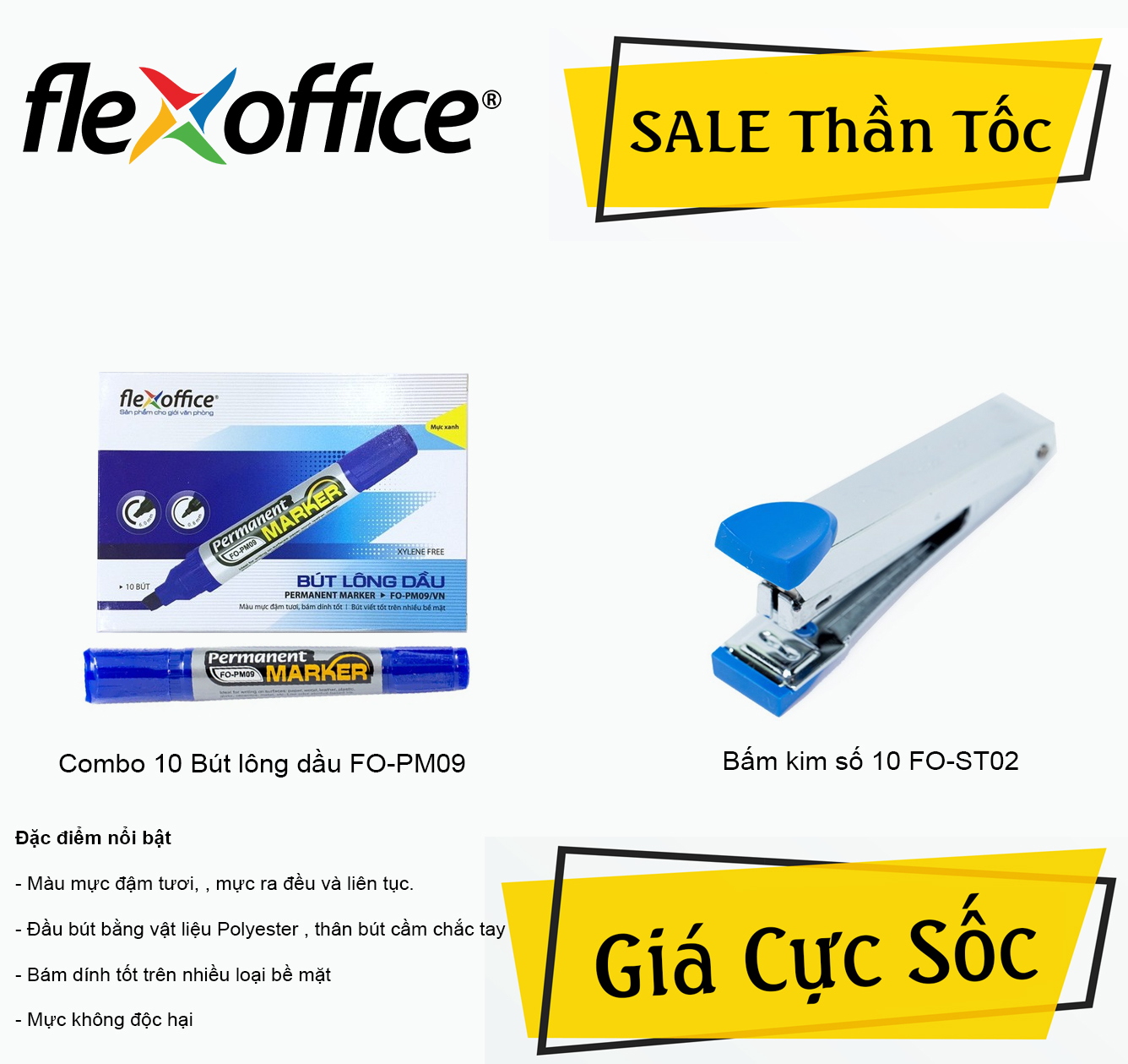 Combo 10 Bút lông dầu FlexOffice FO-PM-09 và Bấm kim số 10 Flexoffice FO-ST02