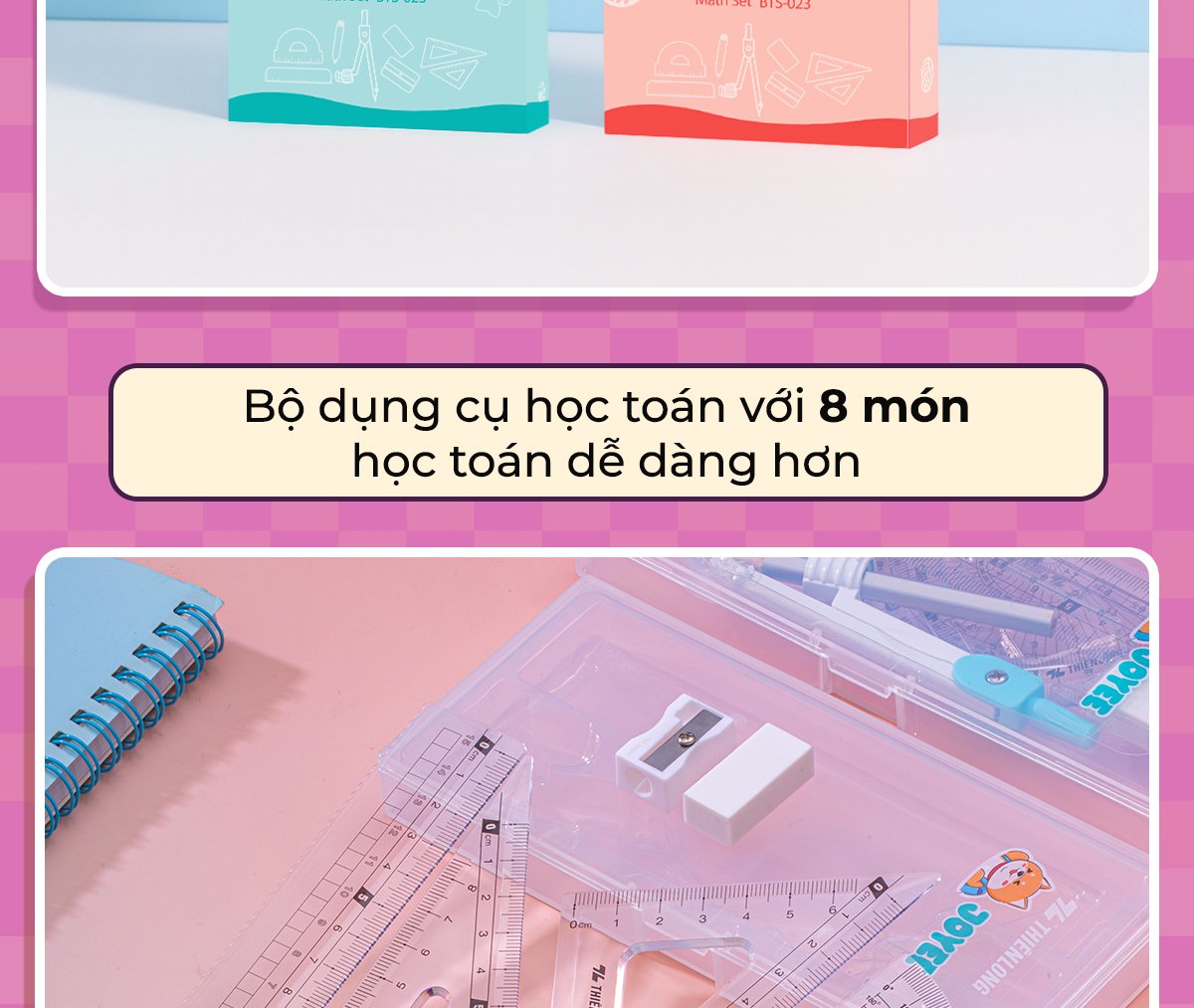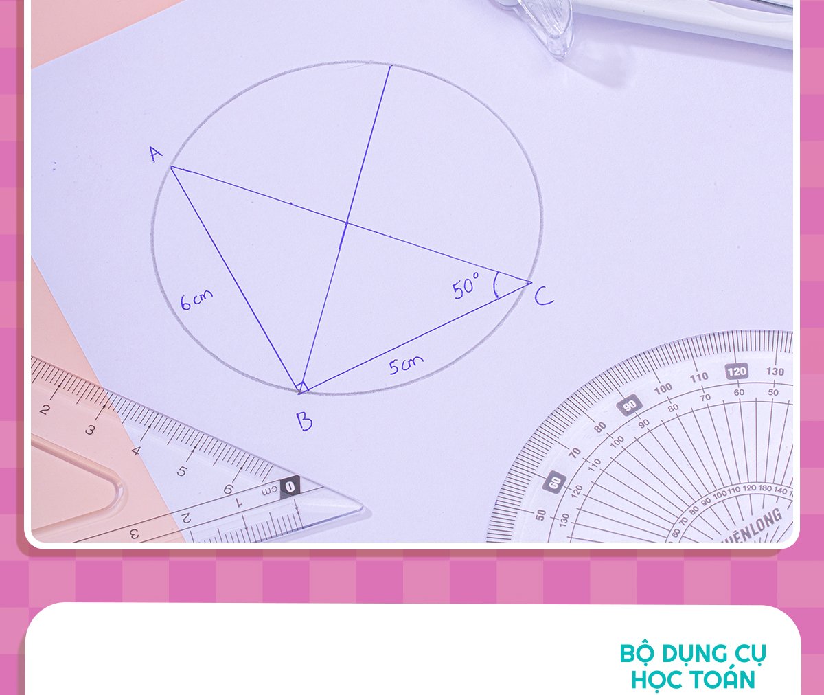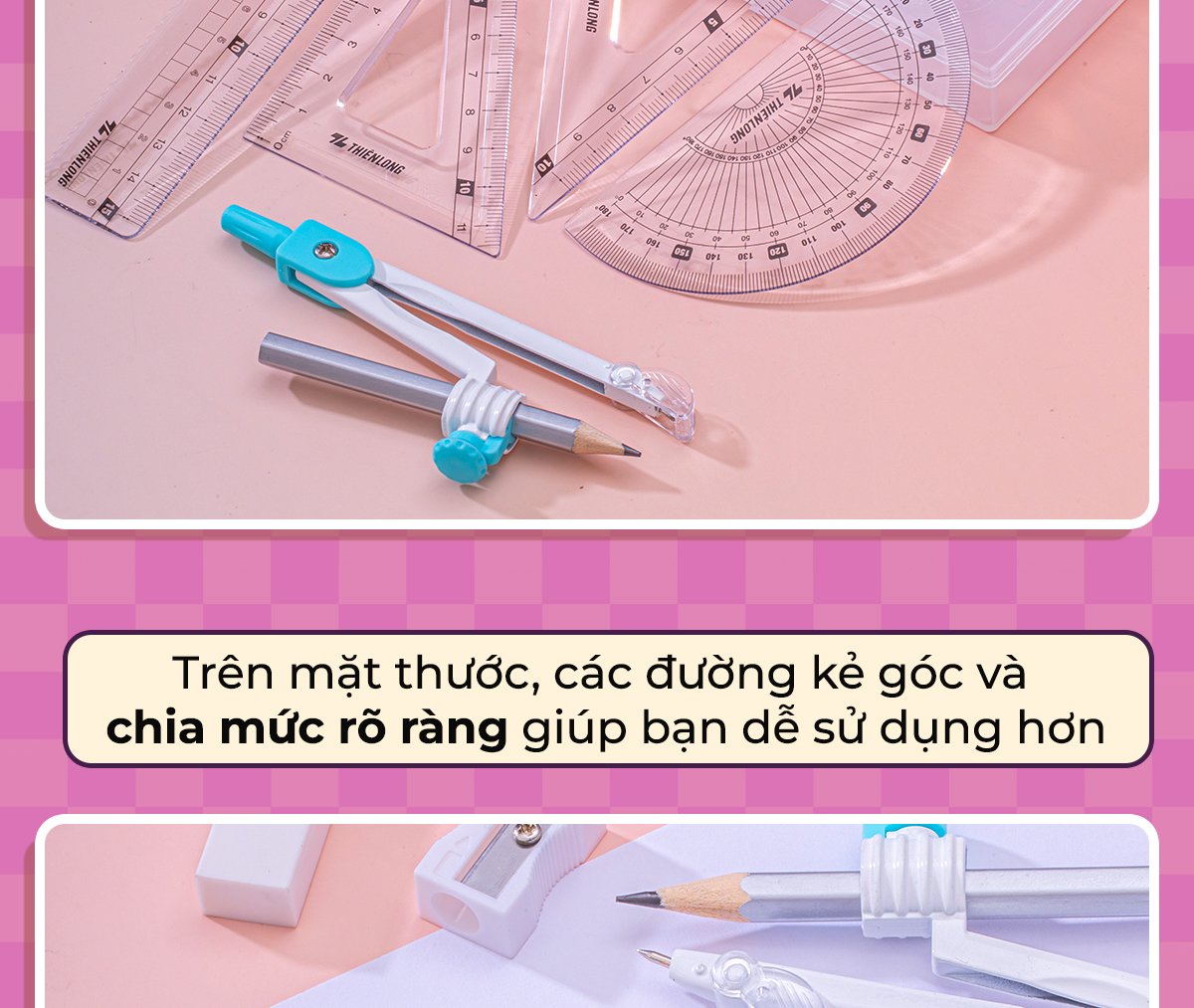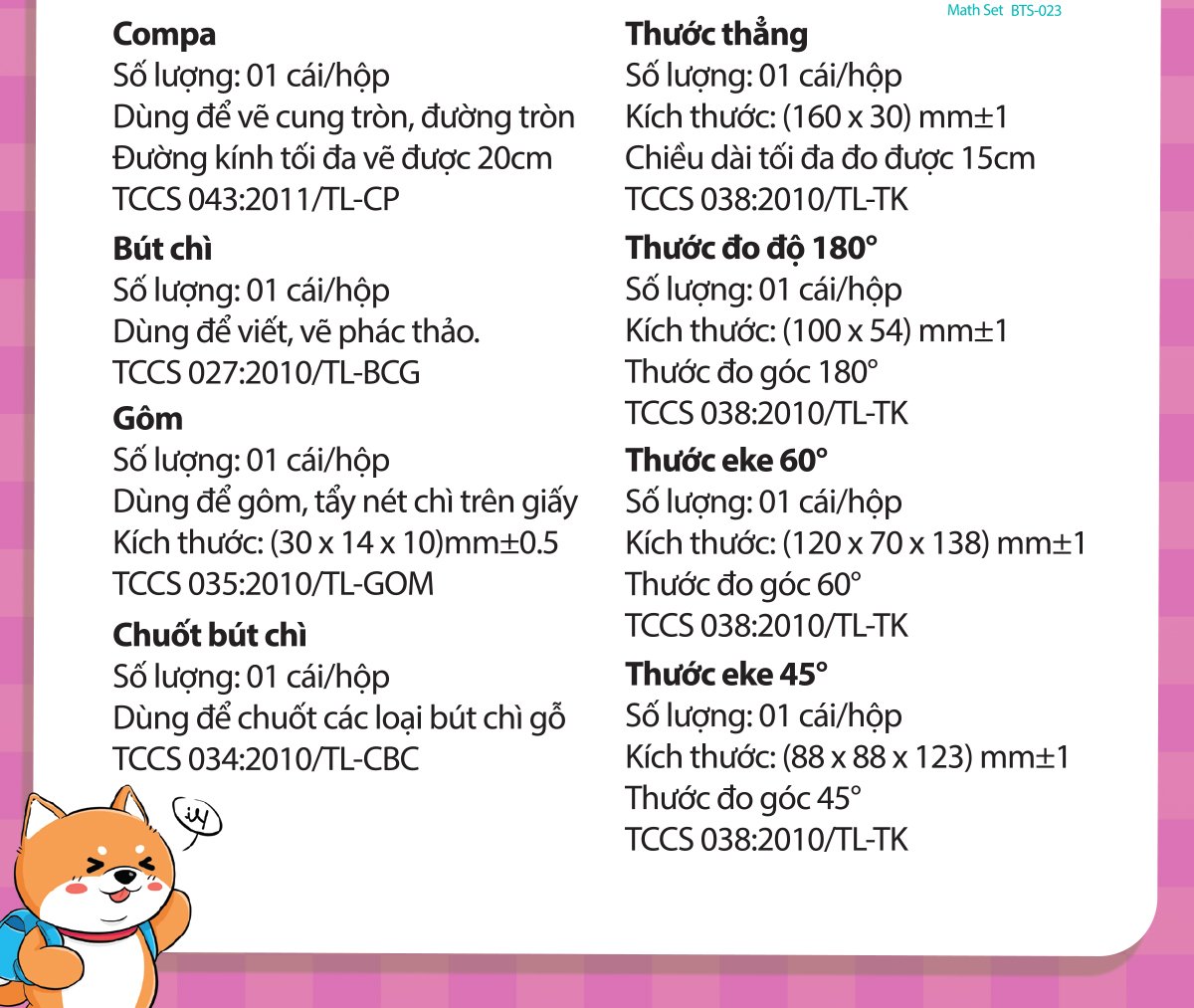 | Bộ dụng cụ | Thước thẳng, Eke 45° và 60°, Đo độ, Compa, Bút chì, Chuốt, Gôm. |