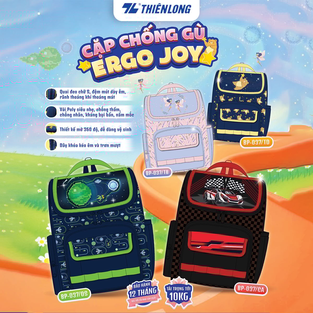Cặp chống gù Ergo Joy BP-037 là dòng balo học sinh thiết kế công thái học, giúp giảm áp lực lên vai và lưng, hỗ trợ bé giữ dáng chuẩn trong suốt quá trình học tập. Sản phẩm kết hợp nhiều họa tiết sinh động, phù hợp cả bé trai và bé gái.