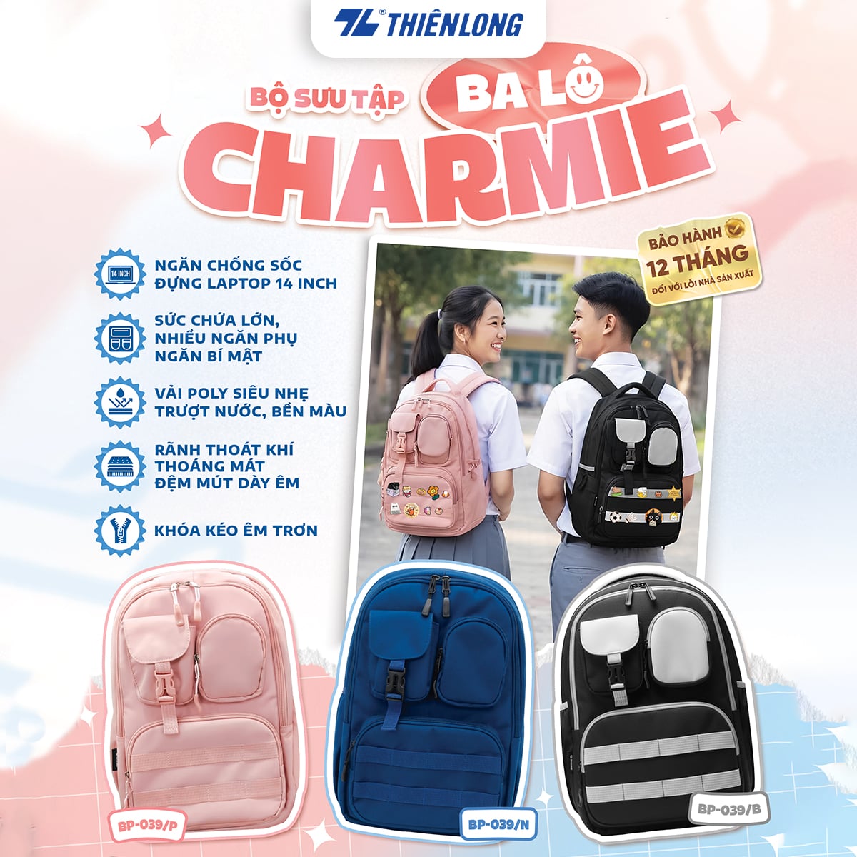 Balo Charmie BP-039 của Thiên Long mang phong cách trẻ trung, hiện đại, phù hợp cho học sinh – sinh viên. Thiết kế thông minh với ngăn chống sốc riêng biệt cho laptop 14 inch, giúp bảo vệ thiết bị an toàn khi di chuyển.
