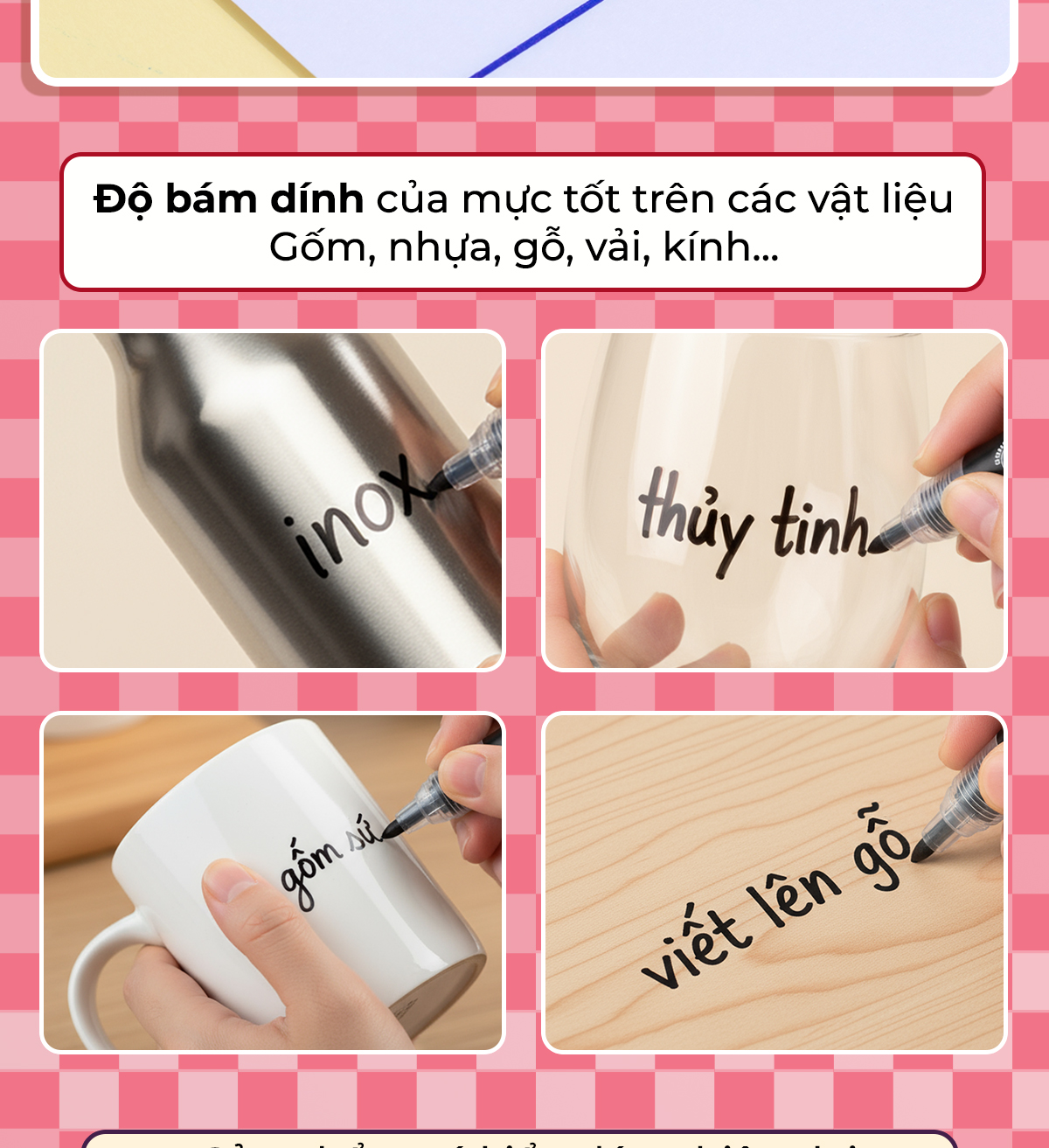 - Độ bám dính của mực tốt trên các vật liệu: Giấy, gỗ, da, nhựa, thủy tinh, kim loại, gốm,...