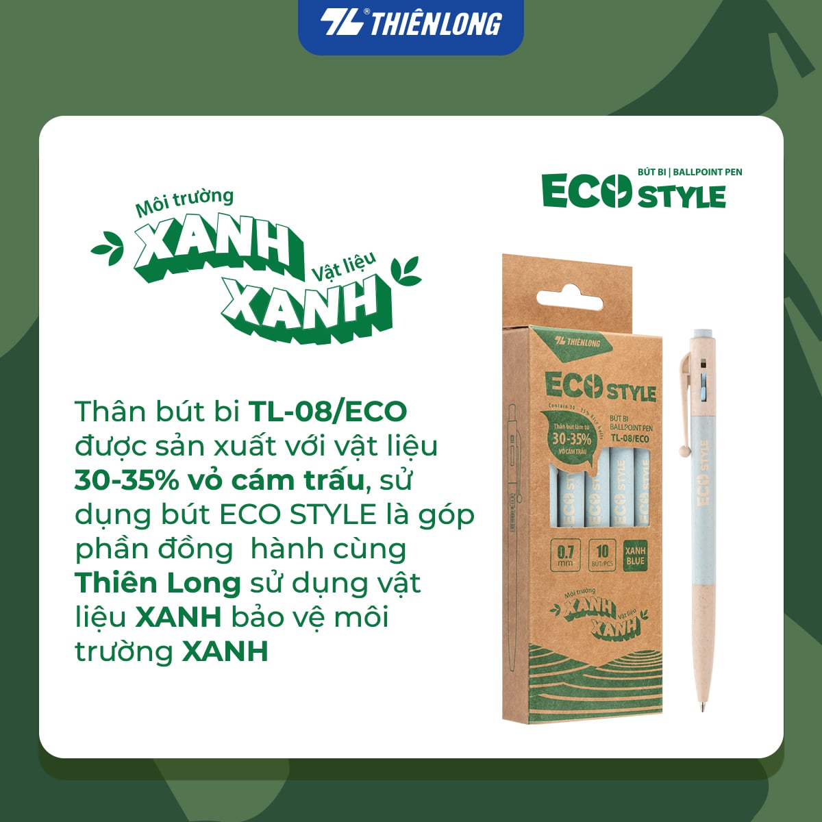 - Thân bút bi Thiên Long TL-08/ECO được sản xuất với vật liệu 55-65% thành phần từ bột đá vôi, sử dụng bút ECO STYLE là góp phần đồng hành cùng Thiên Long sử dụng vật liệu XANH bảo vệ môi trường XANH.
