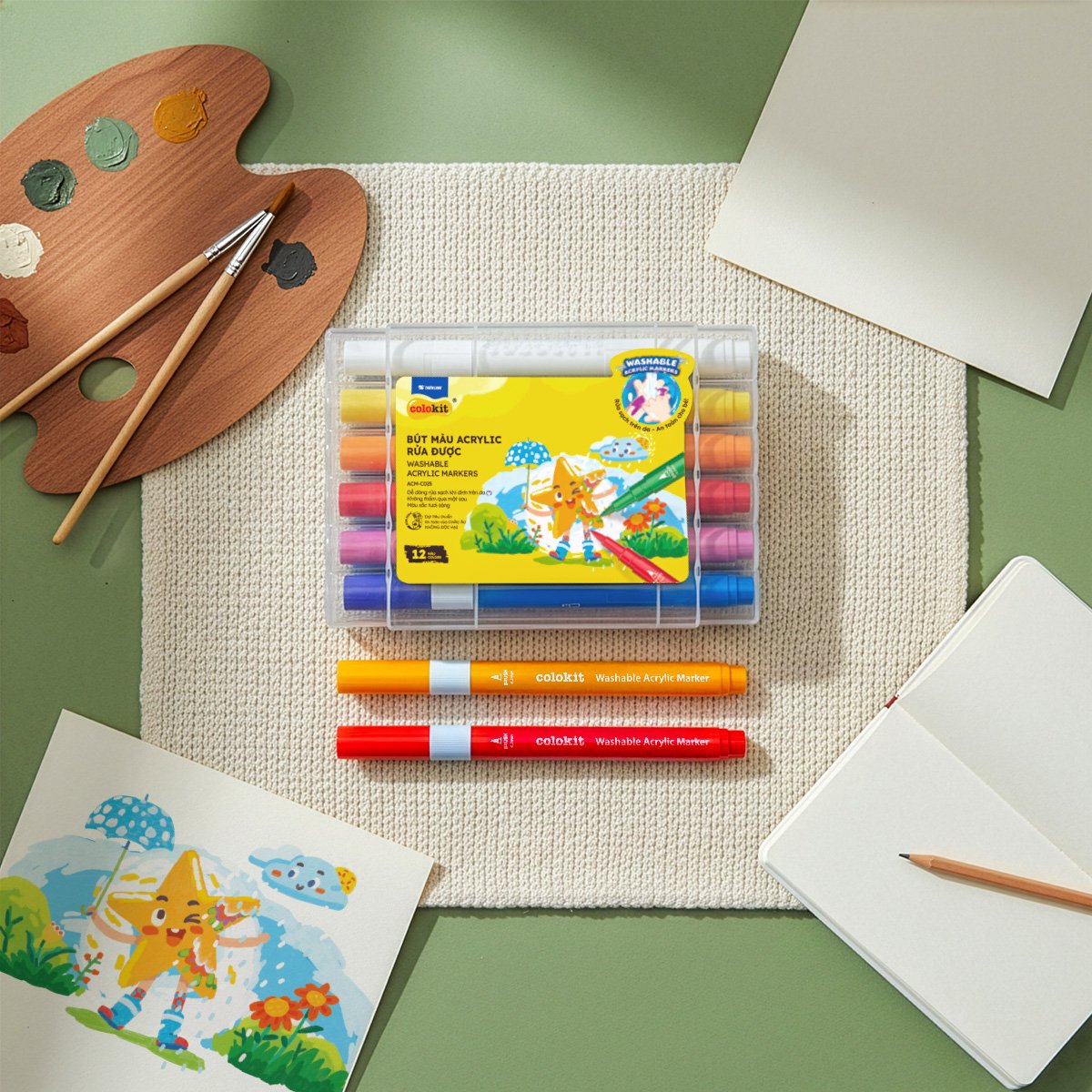 Bút lông màu Thiên Long Washable Acrylic Markers 12/24/36 màu với thiết kế đầu linh hoạt đáp ứng được đa dạng nhu cầu sử dụng. Bút màu Acrylic khô nhanh, chống nước tốt và sử dụng được trên nhiều chất liệu như giấy, vải, nhựa, gốm…